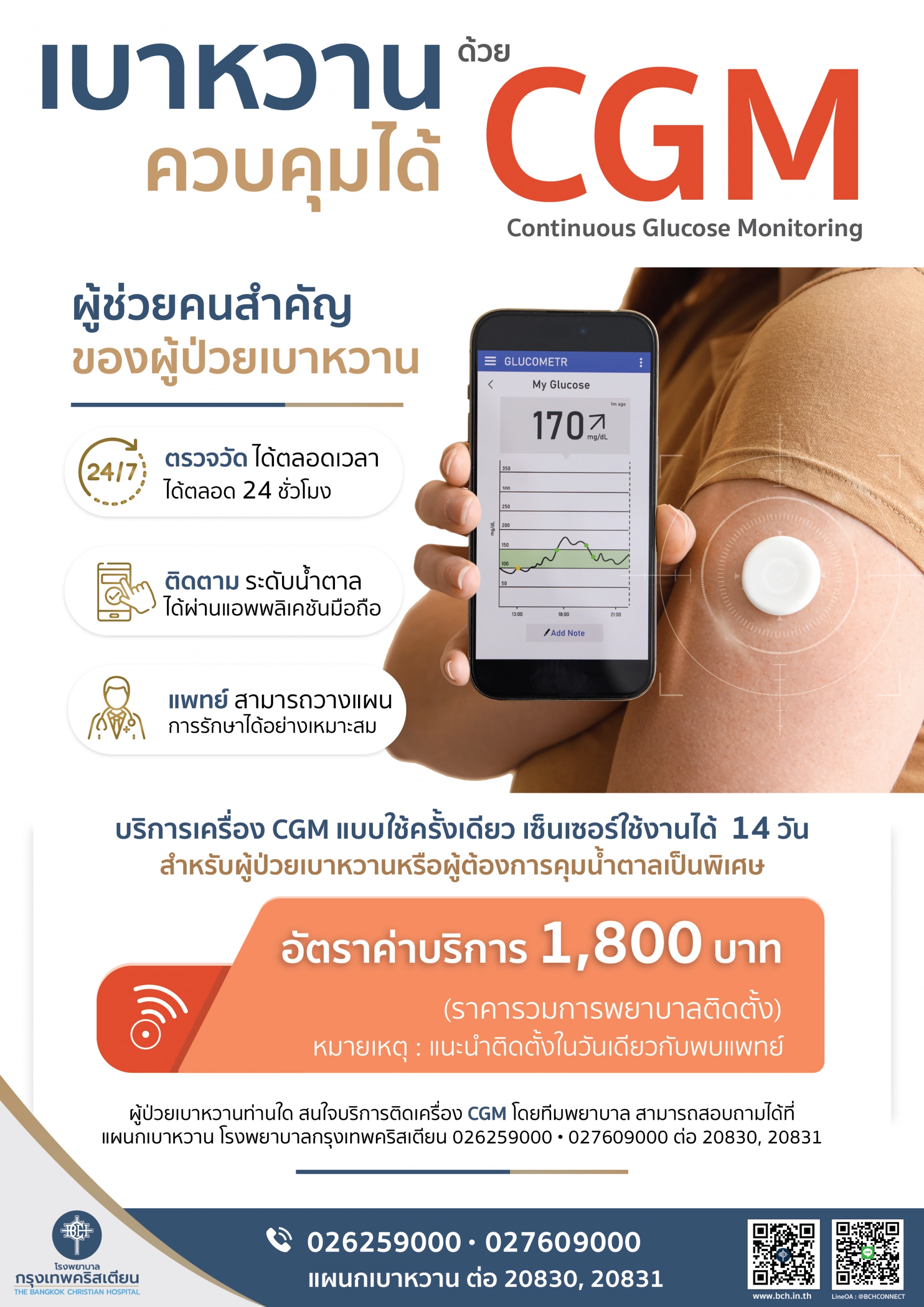 ตรวจวัดระดับน้ำตาลในเลือดได้ ตลอดเวลา 24 ชั่วโมง